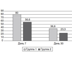 Лечение препаратом Канефрон® Н приводило к объективному улучшению симптоматики острого цистита. В начале лечения средний балл симптоматики у пациенток 1-й группы составил 8,36 ± 0,82, на 3-й день лечения — 5,28 ± 0,92, на 7-й день лечения — 2,8 ± 1,1. При оценке состояния в период наблюдения (30-й день после начала терапии Канефроном Н) значимой симптоматики отмечено не было — средний балл составил 0,43 ± 0,56 (рис. 1).